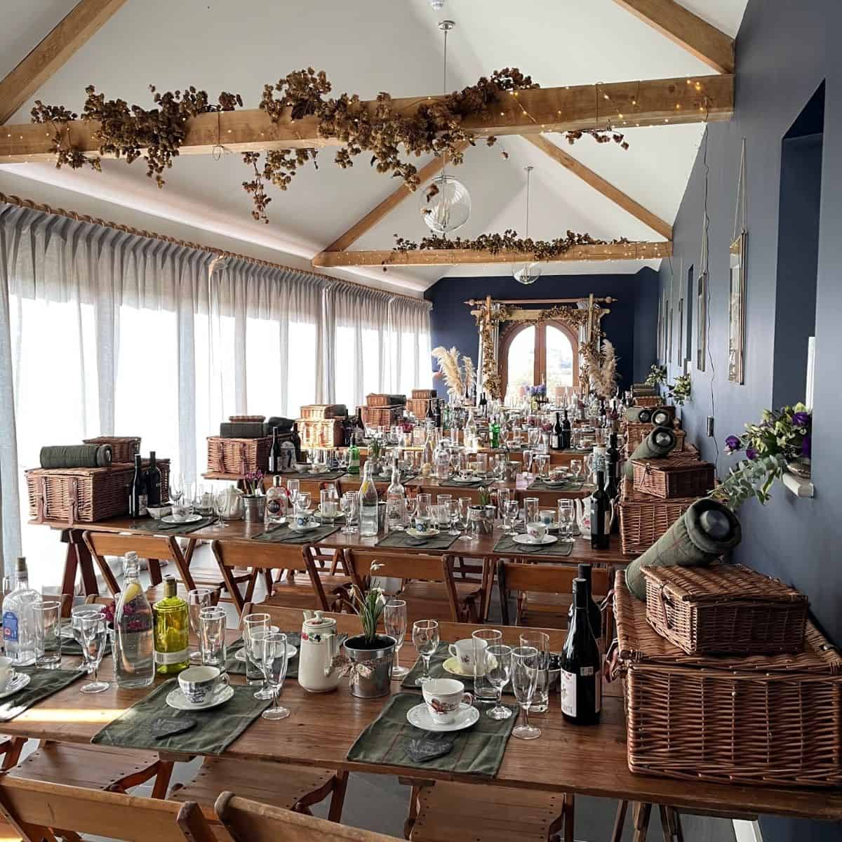 For couples who want extra space, or a second setting for feasting and dancing, The Hangar can be added to your booking. It’s a short walk through meadows from the house and works beautifully for long-table dinners, relaxed gatherings and dancing, or simply giving your wedding weekend more room to unfold.